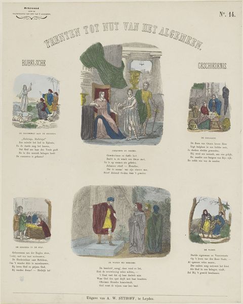 Editor: This print from 1850 by Jan Schuitemaker is titled "Voorstellingen uit het leven van Prins Maurits", showcasing scenes from the life of Prince Maurice. It seems to be a series of historical vignettes, almost like a comic strip. What kind of narrative do you think this print is trying to convey? Curator: It’s a fascinating example of how historical narratives are shaped and disseminated, especially for younger audiences. Consider the context: mid-19th century, a period of burgeoning national identity in the Netherlands. Schuitemaker's print, part of a "Picture-Magazine for Youth," isn’t just illustrating events; it’s constructing a specific image of Dutch history and Prince Maurice’s role in it. What message about Dutch identity do you think it might be sending? Editor: I guess it is about national pride, emphasizing key victories and acts of heroism, kind of simplifying and idealizing the past. It's presenting a specific version of Dutch history, one focusing on military successes, especially those scenes which feature the Prince Maurice. Is it trying to downplay the complexities of the time? Curator: Precisely! And it’s doing so through imagery and simplified narratives suitable for children. Notice the scenes chosen and how they are framed. Each vignette reinforces the narrative of Dutch courage and ingenuity against foreign powers. Think about how the use of a print medium also made this narrative readily accessible and widely distributable, effectively shaping popular historical understanding. Also, how might these images function in the home or classroom? Editor: So, the image serves a dual purpose: to educate children about their history and to instill a sense of national identity and pride. That’s very interesting how images were consciously employed to shape collective memory. I hadn’t considered how influential prints like these could be. Curator: Indeed. It's a reminder that historical art isn’t merely a reflection of the past, but an active participant in shaping how that past is understood and remembered, especially within the broader socio-political landscape. It’s about the politics of imagery.