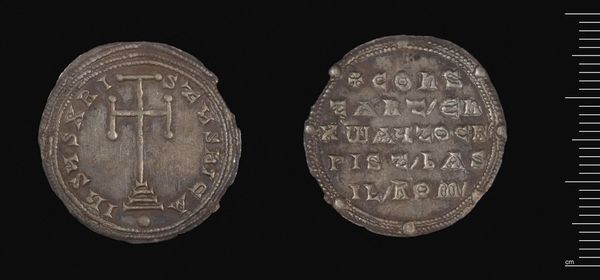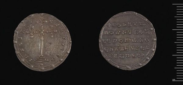 Curator: At first glance, the texture is what grabs me; it's worn, almost smooth, like a pebble shaped by the sea. Editor: Indeed. We're looking at a coin from the reign of Michael III, a Byzantine emperor. It's a small thing, just under 2 grams. Curator: And yet, it held immense power. The imagery, particularly the cross, serves as a potent symbol of imperial authority intertwined with religious legitimacy. Editor: Yes, the design is quite striking. The cross, elevated on steps, dominates one side, while the reverse bears an inscription, carefully arranged within the circular format. Curator: This coin circulated during a turbulent period, reflecting not just economic exchange but also the Byzantine Empire's ideological self-presentation amidst internal strife and external pressures. Imagine the hands it passed through! Editor: Contemplating its materiality alongside its symbolic function really enriches our understanding. Curator: Absolutely. It reminds us that even the smallest objects can carry enormous historical weight.