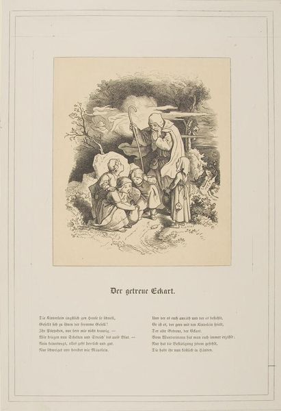 Editor: This illustration from "Hermann und Dorothea," likely from 1853, depicts a group of people traveling with a cart. There’s a real sense of movement, a journey unfolding. What cultural echoes do you hear in this image? Curator: I see echoes of resilience and displacement. The figures burdened with belongings evoke images of migrations throughout history. Notice how the artist renders the bundles; they're not just objects but symbols of a disrupted home and a longing for stability. The wheel of the wagon, though inanimate, is a potent symbol of cyclical hope and hardship. Editor: That's powerful. It makes me think about how universal the experience of migration is. Curator: Precisely. The artist, though anonymous, taps into a deep well of human experience, reminding us of our shared history of movement and adaptation. A poignant reflection on cultural memory. Editor: Thank you. I didn’t expect to find so much depth in a simple illustration.