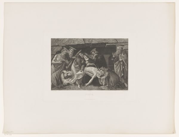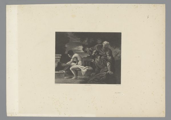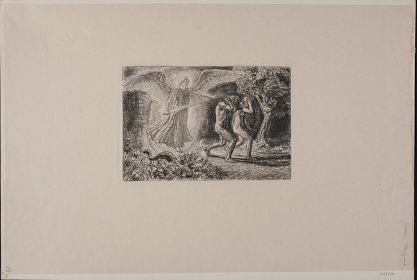 Curator: Welcome. We are looking at an 1880 etching by Édouard Toudouze, titled “Beschermengelen bij slapend kind," which translates to "Guardian Angels by Sleeping Child." What strikes you most upon viewing this piece? Editor: Initially, the texture grabs me; you can see the process of etching in every mark, almost feeling the artist’s hand. The tonal range is interesting—deep blacks against areas of stark whiteness. Curator: Absolutely. Observe how Toudouze orchestrates light and shadow. The contrast serves not just to illuminate the scene but also to emphasize the musculature and forms of the angels, giving them an almost sculptural quality. The composition has a pronounced diagonal dynamic, from left to right. Editor: Right, it feels stagey, doesn’t it? The narrative is quite contrived, in that Romantic, allegorical mode. You know, an emphasis on the ethereal beings suggests that these scenes probably served more bourgeois moralizing ends than more traditional forms of print production for common folk. Curator: A fair assessment. Though the scene teeters close to the saccharine, I'm interested in how the angels physically struggle. See their strained gestures and concerned countenances; the protective role is not passive but a kind of labor. They hold a covering around the sleeping child, yet are forced to engage their whole bodies in an exertion of force. Editor: This attention to detail and physical reality, even within a fantasy scene, elevates it above mere sentimentality. We can practically imagine the studio and his assistants who actually crafted the piece. Also, consider the socio-political climate—anxieties around childhood and protection are nothing new! How fascinating this all became embedded within print culture, too, mass produced for an anxious generation. Curator: Precisely. Toudouze is toying with these oppositions: celestial versus terrestrial, struggle versus ease. These internal tensions keep the artwork alive. Editor: I agree. And it's a welcome reminder that even supposedly ‘high art’ can reveal anxieties deeply rooted in the everyday, materialized through careful—and arduous—etching processes. Curator: Thank you. Together, we’ve hopefully illuminated the layers of this work.