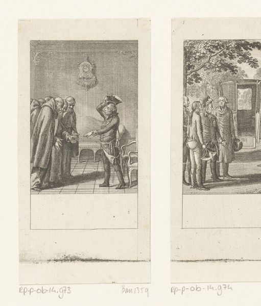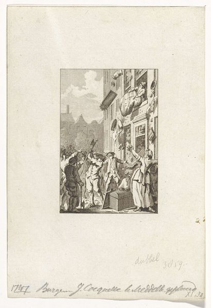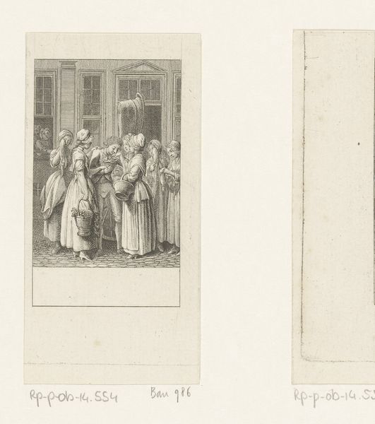 Curator: Let’s take a look at Daniel Nikolaus Chodowiecki’s 1789 engraving, "Joachim en Albrecht lopen met rector Wimpina voor aan de processie," currently held at the Rijksmuseum. What’s your initial impression? Editor: Stark. It evokes a distinct sense of 18th-century Berlin, with its almost severe clarity and regimented figures. The monochromatic palette feels historically accurate, giving the scene an austere feel. Curator: Chodowiecki was known for his precise engraving technique, emphasizing the lines to define form. He worked during a period of growing interest in realism and moralizing narrative, which significantly shaped the market for printed images, impacting distribution and consumption of art. Note the careful depiction of fabrics and the subtle shadowing he achieves, presumably enabled by developments in printing at the time. Editor: Absolutely. It's interesting to consider the social context of processions like these. Who was allowed to participate, who was excluded? These performances of power solidify the existing hierarchies, enforcing dominant ideologies through symbolic display. Also the gaze of the spectators, look how closely it resemble what is on the process? Do you think that Chodowiecki was criticising those dynamics by any means? Curator: The uniformity of the lines, indicative of the printing processes and skills needed to make them, reflects a burgeoning era of mass production that affected everything from texts to images. Did such new forms influence access to this kind of subject matter? Chodowiecki found fame crafting illustrations for popular literature, his graphic skill and industrial savvy enabled social commentary through readily accessible, and relatively affordable images, even though most prints of the time served decorative or didactic purposes. Editor: I think so, and while the image seems ostensibly neutral, we cannot forget that this visual record privileges certain narratives over others. To the spectator, the solemnity could speak of state endorsement; but for others, exclusion. What kind of social capital did partaking in processions afford them and those who were intentionally or unintentionally overlooked by this particular system? Curator: His use of print, particularly engravings, made art more accessible, moving it beyond elite circles, with some unintended consequences, such as reproductions and imitations by those that were less skilled with the materials and thus devaluing the artistic process as a whole. What should remain in sight are not just his skills but also the era’s dynamic shift in artistic distribution enabled by evolving methods of production and an expanding marketplace. Editor: Thinking about it from this vantage point underscores how every artifact carries layers of sociopolitical coding embedded within. It reminds me of current dialogues on power, access, and how artistic narratives reflect and reinforce the frameworks defining inclusion and recognition.