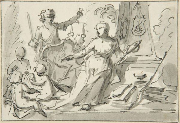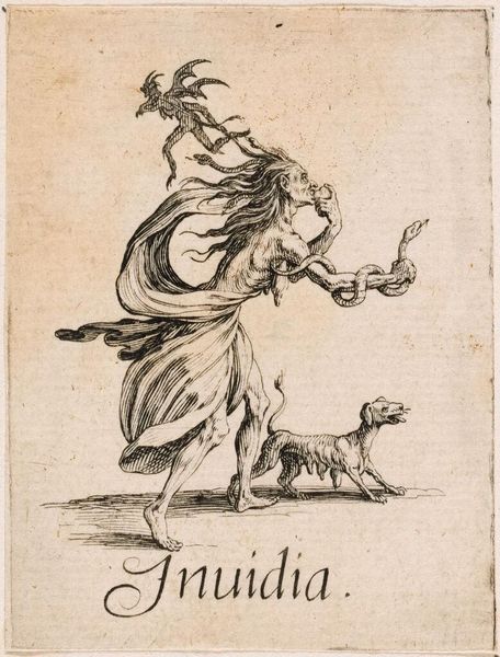 Curator: What a fascinating work! This is "Envy" by Jacques Callot, and though we don't have an exact date, it was created sometime between his birth in 1592 and death in 1635. Editor: It's immediately striking. The linear quality creates a frenetic energy, and the figure is almost grotesque. Curator: Indeed, Callot has masterfully depicted Envy as a haggard figure, complete with snakes coiling around her and a grotesque demon flying above. Snakes were of course, a common symbol for evil and deceit. Editor: And what of that dog? She looks quite miserable and gaunt as if perpetually hungry, an enduring emblem of insatiable craving. The body language is so skillfully wrought. Curator: Precisely! Callot uses these potent symbols to create a lasting image of human vice. It's a stark reminder of envy's destructive nature. Editor: A chilling exploration rendered through rigorous technique, the detail is remarkably precise. Curator: Indeed, Callot's masterful etching leaves a lasting impression about the self-devouring nature of envy.