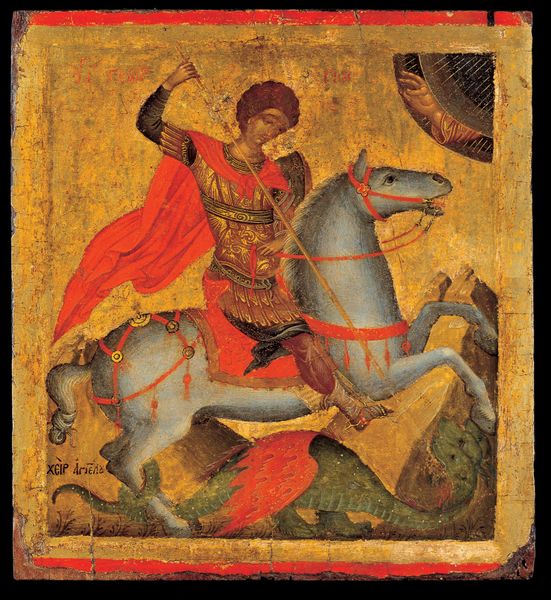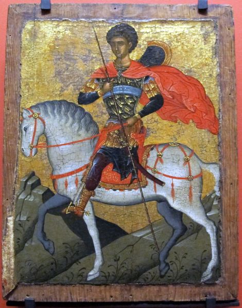 This Orthodox icon depicts Saint Nikita slaying a demon, a visual narrative deeply rooted in the cultural and religious context of its time. The icon presents a powerful display of faith and triumph over evil, reflecting the values of the Orthodox Christian tradition. Saint Nikita, haloed and wielding a sword, represents divine power, while the demon symbolizes the challenges to spiritual purity. The scene, charged with conflict, portrays a moment of intense struggle, resonating with viewers on an emotional level. Traditional representations of good versus evil are maintained here, as the visual elements underscore a clear moral dichotomy. This image speaks to the broader societal concerns about moral virtue, inviting reflection on personal struggles and the pursuit of righteousness.