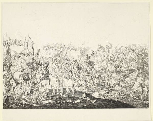 Editor: This is John Hall’s engraving, "Koning Willem III tijdens de slag aan de Boyne, 1690," created in 1779. It's quite a busy image, depicting a historical battle. The detail is amazing considering it’s just an engraving! How do you interpret the symbolism embedded within this scene? Curator: I see a potent image steeped in cultural memory, particularly concerning power, conflict, and legacy. The central figure, William of Orange, is strategically placed, elevated on his white steed, signifying not just leadership but perhaps also a certain divine right. Note how the chaos of battle surrounds him, yet he remains composed, a stoic emblem against the storm. It is tempting to see how the iconography and representation, rather than any commitment to representational truth, dominates this image, where meaning takes precedence over observation. Does it prompt thoughts about the victor's narrative being visually reinforced here? Editor: Definitely. It's hard to miss the implied narrative of triumph, even in the midst of battle. So, are there specific symbols that point to his authority? Curator: Consider the light, Editor, and its directional emphasis on William. Light in art often represents divine favor or enlightenment. Furthermore, the posture of the soldiers, the positioning of their weapons—all these elements converge to amplify William’s central, powerful role. Think of how the engraver uses well-known symbols to manipulate perception. But doesn't the evident drama feel somewhat staged, less like raw historical accuracy and more like crafted propaganda? Editor: I agree. There's a certain grandeur that feels deliberately constructed, almost like a stage play. Seeing it that way, how does that influence its impact on viewers over time? Curator: The image continues to shape and solidify perceptions, reinforcing a specific interpretation of historical events and individuals. It highlights the lasting influence images have on collective consciousness, even centuries later. Do you think, viewing it now, we can still see how the original intention informs our understanding, despite the distance of time? Editor: That's a powerful thought. Recognizing the constructed nature of these historical images makes you question what other narratives might be missing. Curator: Indeed. It urges us to critically examine the visual languages employed in shaping history, understanding the emotional and cultural weight such imagery carries through generations.