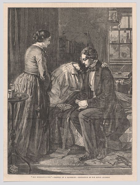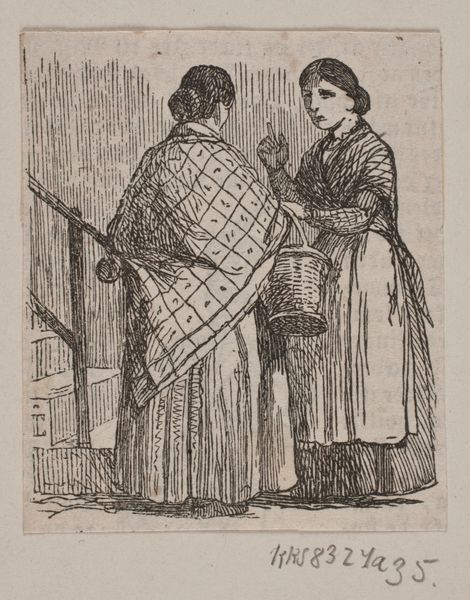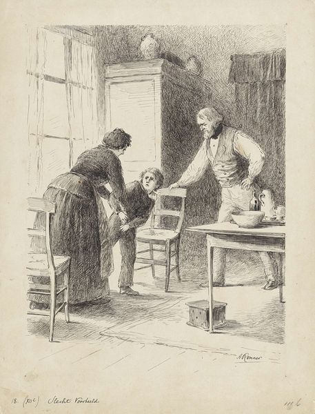 Editor: This is "Domestic Dispute" by Lucien, it's a pen and ink drawing. It gives me a rather tense feeling with the two figures seemingly arguing. What’s your take on this piece? Curator: Well, look at the materiality of it. Pen and ink—cheap, easily accessible. This immediately suggests a democratization of art, focusing less on expensive mediums and more on depicting everyday life. See the subject matter, the squabble: this places the work firmly in the realm of genre painting, showing us that art isn't just for depicting the nobility but could represent the working class. How are these people placed in relation to each other? Editor: She's standing and he's seated, plus she's got her arms crossed like she's not backing down. The table between them has a pot, bottle and plate on it...almost like props. Curator: Exactly! The table, with its ordinary objects, isn't just part of the scenery, it's almost like set dressing in a stage play. What would that tell you? Think about it— what does the use of realism combined with this dramatic setup suggest about the artist's purpose? Editor: Maybe they’re trying to draw attention to a reality of the working class, perhaps some criticism? Curator: Precisely. Lucien uses these readily available materials, a basic form of artistic production, to hold a mirror to social realities. It blurs lines of fine art by showing life outside of idealization, consumption by everyday citizens, and highlighting domestic turmoil. That makes the work relevant. Editor: I see. So, the very materials and subject contribute to a broader social commentary. Thanks! Curator: Indeed. The value lies in making art accessible, of portraying what is often unseen and bringing it to the fore. Food for thought!