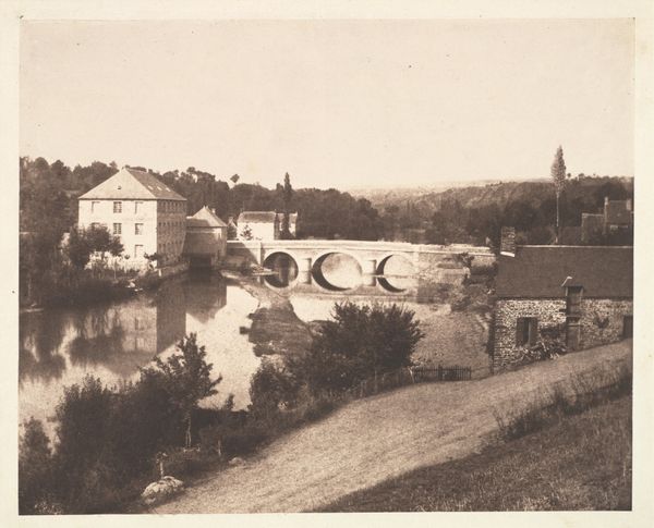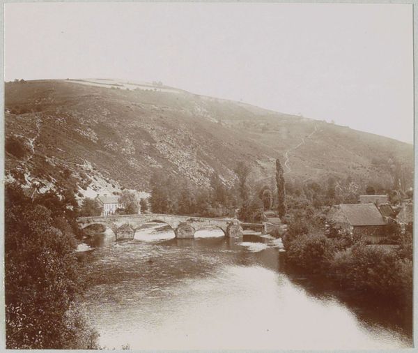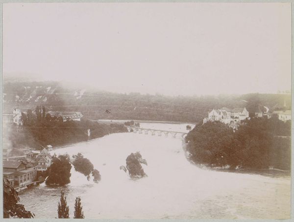 Editor: This photograph, "Waterval in de Jordanne te Aurillac," taken in 1903 by Delizy, showcases a cityscape with a prominent river and waterfall. The monochromatic palette lends it a rather subdued, almost melancholic atmosphere. What can you tell me about this photograph? Curator: This image provides a fascinating lens through which to examine the relationship between urbanization and nature at the turn of the century. Consider the built environment pressing in on the Jordanne River. How does this industrial encroachment impact our understanding of environmental justice? Editor: That’s a great question, I hadn’t thought about it that way. It’s easy to get lost in the pretty scene, but… Curator: Precisely. And isn’t the aesthetic choice of photography as a medium significant here? The documentary quality can highlight the contrast between the idyllic image of the waterfall, often associated with "pure" nature, and the encroaching structures. The muted tones flatten the sense of the image, no? Editor: Definitely. It’s not as romanticized as a painting of the same scene might be. Curator: Indeed. The flatness almost speaks to the reduction of lived experience caused by industrialization and urbanization. And whose stories are included or excluded by this selective capturing of this space? Who had the resources and the power to create images like this? Editor: That makes me consider the perspective of the people who lived in those buildings along the river. Were they celebrating progress or lamenting the loss of the natural landscape? Curator: Exactly! It encourages us to analyze how such images are not neutral records, but constructions that actively shape our perceptions of progress and environmental change. Editor: Thank you! I definitely see how it invites us to consider those issues more critically.