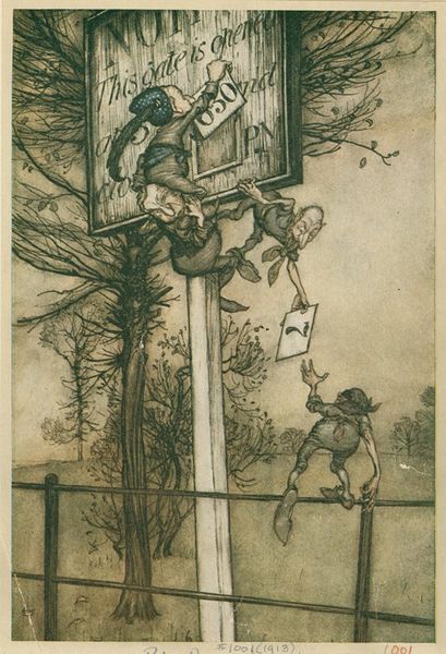 Curator: The stillness in James Tissot's etching, "The Hammock," created around 1880, is palpable. The Metropolitan Museum of Art houses this small gem, which presents a woman lost in her book in a peaceful outdoor setting. The scene exudes calm. Editor: Yes, I'm immediately struck by that sense of tranquil domesticity, and by the strong diagonal created by the hammock and the woman's repose. There’s a kind of studied casualness that feels very particular to its time. Curator: The hammock itself serves as a potent symbol. Resting in a hammock can be seen as symbolic of contemplation, or even surrender, linking to a deeper psychological state. Hammocks, historically, represent a suspended state of being, literally and metaphorically, caught between worlds. Editor: Interesting! Because beyond its symbolic dimension, it speaks volumes about leisure and social class. This is a woman of privilege, secure enough to spend her time reading outdoors. The placement of the parasol emphasizes this social context further, doesn't it? A barrier against the sun's "damaging" effects! Curator: Absolutely. And note the book; its pages slightly unfurled are a cultural artifact itself. It suggests a woman engaging with intellect or perhaps escaping through the pages of fiction. Consider books not just as a medium, but as emblems of knowledge and status in the 19th century. Editor: Tissot’s style here also captures something important. The sketchiness of the etching—the seemingly unfinished quality—paradoxically adds to that impression of an intimate, unguarded moment. It’s both calculated and yet manages to look spontaneous, doesn’t it? What do you make of that low stool beside her, partially cropped out of view? Curator: Good point; cropped details add immediacy to the image! As for the stool—perhaps suggesting an interrupted action, or a subtle indication of domestic support, a resting place for a cool drink or sewing perhaps, grounding the idyllic scene in the everyday realities of the time. Editor: So it's a glimpse into a specific culture of leisure, cleverly using recognizable and shared visual cues. A real commentary on the times as it represented itself. Curator: Precisely, capturing both individual tranquility and wider socio-cultural currents within a simple scene. A peaceful escape and coded record.