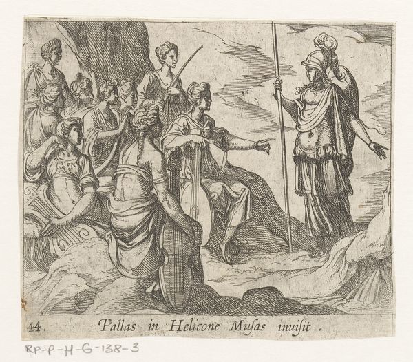 Editor: This is "Plate 19: Minerva at Envy's Cave (Pallas Invidiam in Aglaurum incitat), from Ovid's 'Metamorphoses'" by Antonio Tempesta, dating back to 1606. It's an engraving, and the scene is quite stark. I’m struck by the contrast between Minerva's crisp armor and the twisted figure in the cave. What does this engraving tell you? Curator: Considering its materiality, this engraving isn't just an image, it's an object born from specific processes: the artist's hand, the metal plate, the printing press. It reveals much about the economics and availability of image production in the 17th century. Notice how the line work defines not only form, but also texture and atmosphere. How might the multiple states, that is, editions, of this print affect its value and accessibility as a visual commodity at the time? Editor: So, the physical process of creating the print influenced its role in society. I hadn't thought about that. Are you suggesting that it's important to consider the labour that went into it? Curator: Absolutely! The skilled labour involved in creating the plate, the paper, the ink, the press operation - each element represents a stage in the print's journey as a tangible and consumable product. Think about where these materials came from and who produced them. The engraver is only one node in a large network of production. Editor: That shifts my perspective. I tend to focus on the narrative—Minerva, envy—but you're highlighting the industrial side of art. Curator: Indeed. Consider the social context: How does access to these images, mediated through printmaking technology, affect the distribution of knowledge and power in early modern Europe? Whose stories get told, and how are they disseminated? Editor: Wow, I am thinking about this very differently now. Thank you, this was very enlightening! Curator: My pleasure. By considering the material conditions of art making, we can develop a far deeper understanding of the historical context surrounding the work of art.