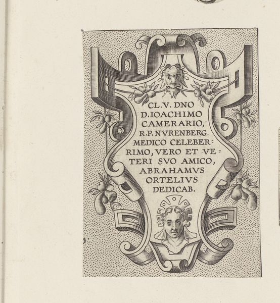 Curator: This engraving, "Rectangular Cartouche with a Bunch of Fruit, Birds, and Masks," dates back to 1590 and is an etching made of metal. I am struck by the intricacy and delicacy of the lines considering the medium. What stands out to you? Editor: I find the composition really interesting. It is formal, very symmetrical. What's your take on this kind of design, especially thinking about the materials involved? Curator: Well, as a materialist, I think we must ask how metal engraving intersects with class and labour during the Northern Renaissance. This wasn't some spontaneous expression; it was a carefully produced object, think of the metal itself - where did it come from? The skilled labour needed for engraving. Were those fruits and birds signifiers of the patron's wealth and access to exotic goods? These prints, due to their reproducibility, functioned as both art and a form of currency. Editor: That's a great point. So, it's not just about the imagery but also the whole system that allowed for its creation and circulation. Did the use of metal, and this print form, give access to a broader audience than a unique painting would? Curator: Precisely! Printmaking allowed for wider dissemination of imagery, although ownership was still largely confined to wealthier circles, however it suggests an emerging shift towards broader accessibility within a specific social strata. Editor: This has shifted my perspective quite a bit; seeing the material constraints and possibilities gives this object more life than before. Curator: Exactly. We move beyond aesthetic appreciation to understand art as embedded in its socio-economic and material conditions.