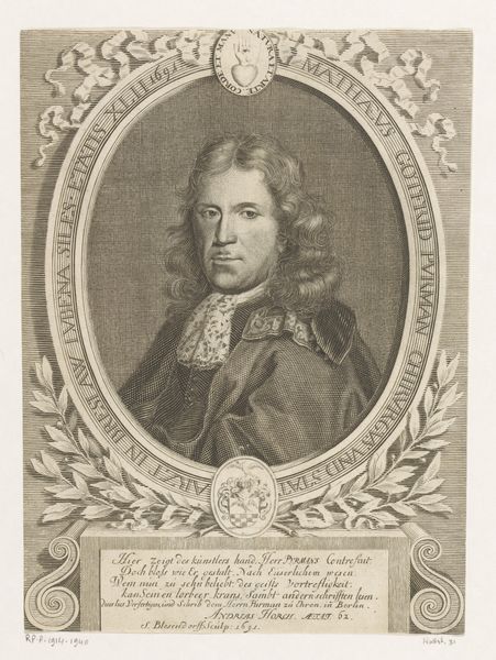 Editor: Here we have "Portret van de Parijse aartsbisschop Hardouin de Péréfixe de Beaumont," an engraving by Pieter van Schuppen, from 1667. It's quite detailed, and the figure's gaze is really striking. How do you interpret this work? Curator: Notice the elegant balance achieved through the oval frame containing the subject. The composition masterfully guides our gaze across a variety of textures, from the intricate background pattern, which gives a very clear sense of depth to the more plain clothes worn. Editor: So you are looking at the interplay between textures to communicate a message? Curator: Precisely. The texture and detailing enhance our focus on the Bishop's face. It's also interesting how Van Schuppen utilizes line to suggest the form and structure of his subject. It allows light and shadow to provide a feeling of roundness in this engraved format. Editor: I see what you mean, especially regarding how texture affects what captures our attention. What about the details *outside* the portrait? Curator: The carefully considered composition of decorative details around the portrait enhance the balance of light and shadow in the portrait. The eye is also subtly drawn by each inscription, adding textual balance to the design. These choices serve to accentuate the qualities in this well-balanced composition. Editor: That makes a lot of sense. I never really thought about that when it comes to the inscription or surrounding patterns, I was really stuck on reading the man's expression. Thank you! Curator: Indeed, a formal approach can often enrich our viewing experience by exposing subtleties easily missed in the artwork.