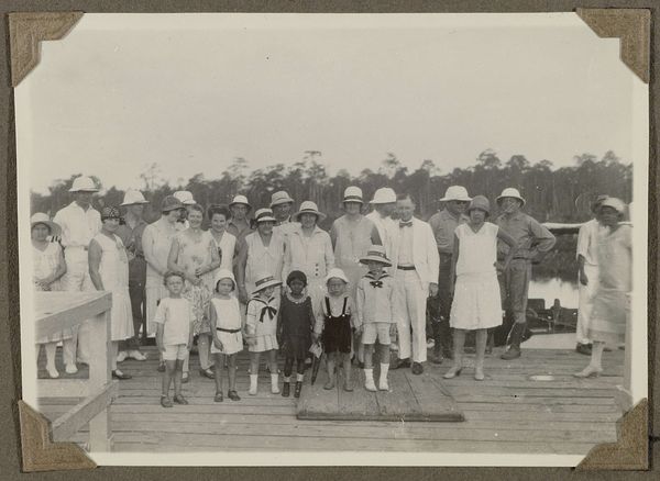 Editor: Here we have a photographic print entitled "Groepsfoto bij de villa in Simpangampat," which translates to Group Photo at the Villa in Simpangampat, dating back to 1916. Something about its worn texture and staged composition gives it an incredibly intimate yet distant atmosphere, like peering into a lost world. What stands out to you in this particular tableau? Curator: Oh, it’s more than a tableau, isn’t it? It's a portal. Look at their eyes—or rather, our inability to truly meet their gaze across time. The sepia tones whisper stories of colonial life, don't they? All that dazzling white clothing—such a stark contrast to the landscape and, dare I say, a bit performative. Doesn't it make you wonder about the untold stories shimmering just beneath the surface? Who are these people, and what's *their* story? Editor: I hadn’t thought about the 'performance' aspect before, that need to project an image of… cleanliness? Order? Curator: Precisely. Notice the artificiality: the posed stances, the crisp clothing… This photograph screams "Control." But simultaneously, it reveals cracks. See the children in the front? Their postures hint at the complexities of colonial society; the unwritten rules are already weighing on their shoulders. Don't you feel it? Editor: I do. It’s strange to think about what the photographer chose to show versus what remained unseen. It definitely invites speculation. It’s also such a stark contrast between the opulence and... and well, the *weight* of it all. Curator: Exactly. The unseen often shouts the loudest. This isn’t just a historical record; it's an invitation to reflect on the shadows of the past that continue to shape our present. Every picture has its own untold story, you see? It’s like peeling an onion, each layer bringing us closer... and sometimes, making us weep. Editor: Thank you! I definitely feel like I see it in a totally different light.