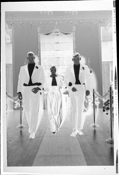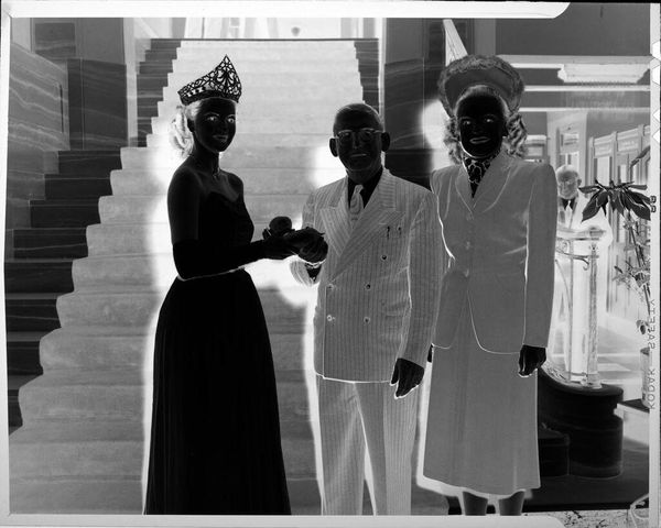 Robert Burian made this gelatin silver print of a young couple playing King and Queen. The photographic process is central here: the gelatin emulsion, spread thinly on the paper's surface, captures light and shadow, recording a staged reality. Photographs like this one were typically produced in studios. What makes this image interesting is that it’s a negative. It allows us to see the material reality of photography, the chemistry that enables the photograph to be produced and reproduced, circulated, and consumed. This photo then, is not just a record of a young couple playing royalty. It also subtly reveals the economic relationships that photography has always been tied to, and the power dynamics inherent in portraiture. It reminds us that every image is the result of material transformation, labor, and social context.