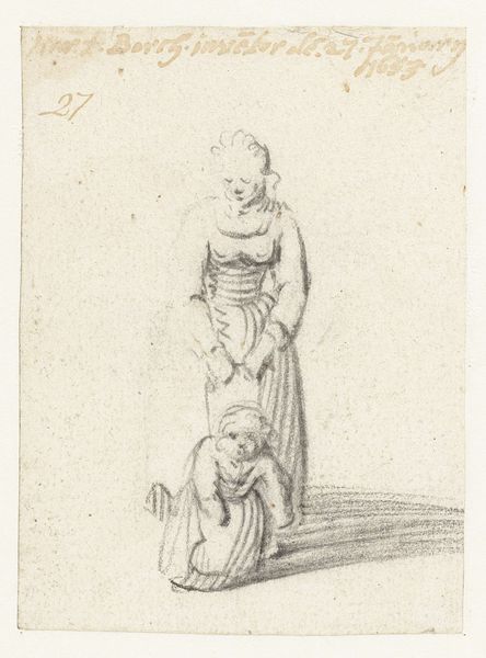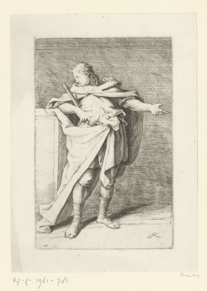 Editor: This etching, "Boy with Sheep" by Hendrik van der Borcht II, dating from 1638, feels strangely intimate, like a glimpse into a very private moment. What strikes me most is the texture; you can almost feel the wool of the sheep. What do you see in this work? Curator: Beyond the charming portrayal, consider the labor inherent in its creation. Etching was a demanding process, involving skilled craftsmanship and careful use of materials. Each line etched into the copper plate represents a deliberate action, a testament to the artist's time and effort. It invites questions about artistic production during the Baroque era: Who was consuming these prints? And how were they distributed? Editor: That's a good point. It wasn't just the artistry, but also a product of labor. How did the choice of etching influence the reach of the work, compared to, say, painting? Curator: Exactly! Etchings like this one could be reproduced, entering broader markets and households than unique painted works. The material conditions shaped the art's consumption and accessibility. Who owned sheep at the time and what social implications might a portrayal like this elicit? Editor: So, thinking about the social context and production method together helps to reframe our understanding of the piece. It shifts it away from solely aesthetic value. Curator: Precisely. By examining the materials, the means of production, and the intended audience, we unveil hidden layers of meaning within “Boy with Sheep." Editor: That is helpful; now, seeing how widespread etchings could be at that time gives the artwork another layer of complexity.