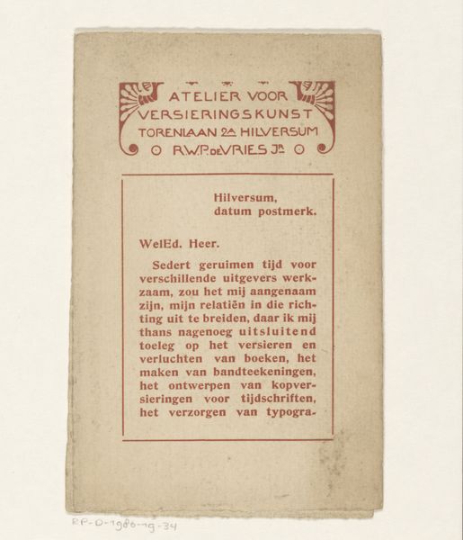 This advertisement for Reinaert de Vos was made with a lithograph stone, so the whole thing comes from a kind of drawing. The color palette is limited, almost monochromatic, giving it a timeless feel. What strikes me is the texture and surface of the print. It's hard to tell exactly what tools Wierink used, but you can see the marks, the kind of granular effect of the stone coming through in the golden brown ink. This is not like a smooth, seamless reproduction; there's a real physicality to it. Look at the animal figures above and below the text. They remind me of folk art and medieval tapestries, but with a touch of Art Nouveau flair. They create a border, framing the text and adding a sense of movement and energy. Wierink's work makes me think of Aubrey Beardsley, who also had a knack for bold, decorative designs. But while Beardsley's work can be a bit decadent, Wierink's has a more grounded, earthy quality. It's a reminder that art is always in conversation, with artists borrowing and riffing off each other's ideas across time.