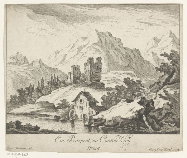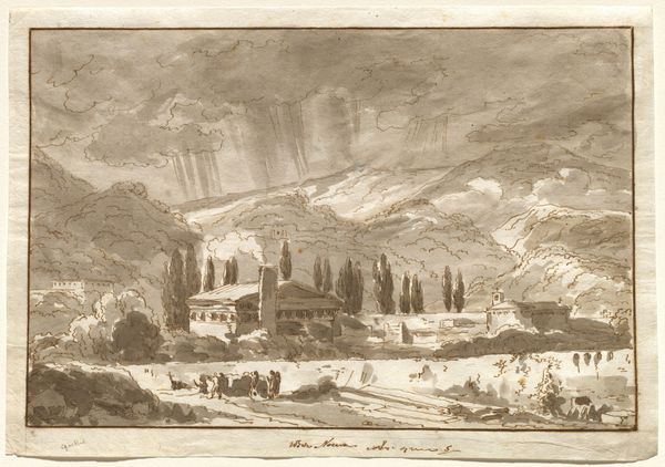 Editor: This is Jan van Aken’s "Mountain Landscape with a River Valley" from around 1652. It's rendered in ink, pencil, and wash... I'm immediately struck by the almost theatrical quality of the landscape, like a backdrop for some unknown drama. What do you see in this piece? Curator: Beyond the immediate vista, there's a feeling of something deeper resonating from this drawing. Landscapes have long served as containers for human emotion and aspiration. In this case, the mountains could be seen as symbols of endurance, resilience. Consider the path winding upwards. What does a path signify to you? Editor: Journey, maybe? Struggle? Getting somewhere? Curator: Exactly! But journeys aren’t simply physical; they often symbolize the path of life itself. Aken offers us a microcosm of the world. Do you notice how small the figures are compared to the immensity of the landscape? It’s a classic device reminding us of humanity’s place within a much grander scheme. These types of symbols allow collective experience, myth and ritual to resonate with the viewers’ sense of place. Editor: So, the landscape itself becomes almost like a character in the drama? Curator: Precisely! And the very medium – ink, pencil, and wash – lends a sense of immediacy, almost like a fleeting memory captured. It feels like we're glimpsing not just a place, but also a feeling. A sense of temporal permanence amidst individual journeys. Editor: I never would have considered how much symbolic weight a landscape could carry. This piece feels a lot richer now. Curator: Art helps us remember. Hopefully these reminders enrich our lives and inform our future.