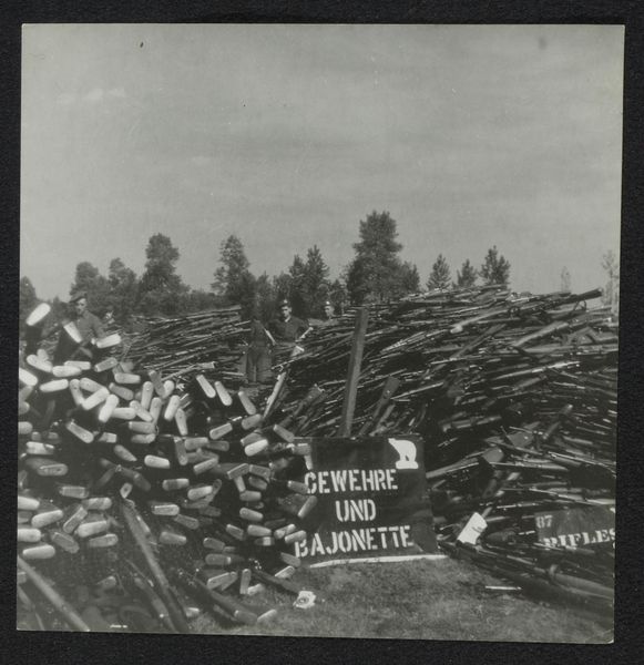 Curator: Good day. I’d like to introduce "Berg schoenen in concentratiekamp Neuengamme," or "Mountain of shoes in Neuengamme concentration camp," a gelatin-silver print, possibly from 1945, by Anefo, housed here at the Rijksmuseum. Editor: My god, what a heartbreaking image. The sheer scale of that… pile… is overwhelming. Like a dark mountain range, built of individual lives cut short. So stark and desolate. Curator: Indeed. This photograph offers a stark view of the unimaginable scale of atrocities perpetrated during the Holocaust. It captures a heap of shoes, confiscated from prisoners at the Neuengamme concentration camp, as evidence after the war. Think about what each pair represents. Editor: It’s sickening. You see more than just discarded footwear, don't you? Each scuff, each tear in that leather is a testament to forced marches, to survival, to resistance perhaps, or maybe just a sign of someone running one last time... trying. Curator: Precisely. The seemingly mundane, like shoes, became tools of dehumanization. Stripping prisoners of their possessions was part of breaking their identity. Their past. Even their dignity. The banality of evil as Arendt defined it is laid bare. Editor: I can almost feel the silence that surrounds it. The image is almost suffocating in its monochrome emptiness. You look for faces, you look for some semblance of the people these objects were tied to but there is just... this vast, accusing void. A visual echo of horror. Curator: As a historical record, it underscores the camp system’s mechanics, while on a deeper level, the image functions as a profound act of remembrance. Anefo’s picture gives form to what we are not meant to forget, the lasting responsibility of bearing witness. Editor: It sticks with you, doesn’t it? That image just bores a hole in you. I find myself thinking, not just of the shoes, but the path ahead, and making damned sure we do better by each other on this road. Curator: Exactly. It serves as an unending question and a potent charge, a warning to future generations, and for today's.