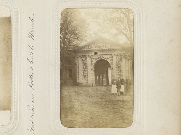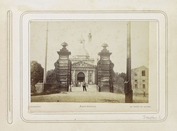 Curator: Here we have a photograph, likely taken between 1885 and 1890 by Wilhelm Ivens. The title translates to "Entrance Gate of the Driemansbrug to the Valkhofpark in Nijmegen." Editor: It's remarkably serene, isn’t it? The subtle gradations of tone create this calm, almost sepulchral mood, while the ordered geometries suggest rigid control of public access to a more Arcadian site, further beyond. Curator: Let's focus on the elements: the strong verticality of the pillars flanking the wrought-iron gate, crowned with ornate spheres that appear to filter light in a visually interesting way. There is strong visual interest and balance here, as if an emblem to Euclidean balance. Editor: To me, those spheres are suggestive. In ancient symbolism, the sphere represents wholeness, the cosmos... placing them atop an entrance – it's almost ritualistic. Consider this park, Valkhofpark. “Valkhof” evokes images of falconry; connecting it with nobility, the sport of kings... Is this entrance a deliberate signal to social class? Curator: Intriguing… if we examine the composition, the bridge arcs from left to center; a dynamic curve plays against the ordered verticals of the gateway, creating an appealing tension of horizontal and vertical rhythms. I can't help but see the interplay of hard stone versus fluid ornamental lines of metal. Editor: That bridge! For me, bridges always whisper of crossing thresholds, both physical and metaphysical. This whole composition frames the viewer, hinting that crossing this barrier promises passage into a realm of privilege, nature tamed. The figure on the right only adds to that sentiment of observation, the keeper of this idyllic world. Curator: I appreciate how this realistic landscape photograph uses a rigid framework and Euclidean symbolism. What this photograph highlights is that rigid balance in composition that defines its aesthetic qualities, in my reading of its formalist aspects. Editor: It's much more than that for me. There is potent iconography that invites exploration on psychological and cultural registers. This photographic essay provides just enough information for the viewer to explore multiple registers of knowledge and feeling.