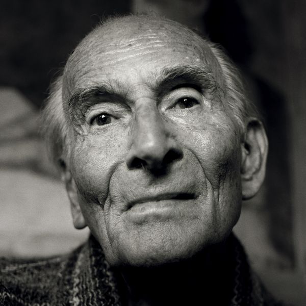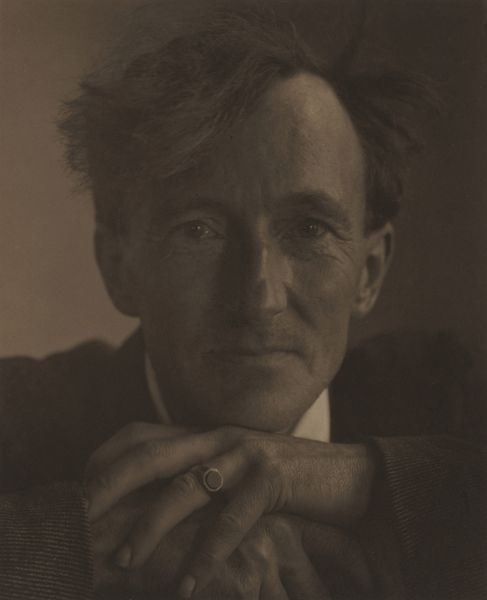 Curator: This gelatin-silver print, created by Paul Strand in 1954, is titled "Alex MacDonald, South Uist, Hebrides". Editor: The face strikes me immediately – weathered and deeply etched. It feels almost archetypal, embodying a specific type of rural stoicism. Curator: Precisely. Strand worked extensively documenting rural communities. I'm particularly drawn to the materiality visible in the photograph – the rough texture of MacDonald's tweed jacket, the chipped paint on the clapboard behind him. The materials speak to a life closely connected to labor and place. Editor: I see so much in that face, and also in his clothes—he has an argyle sweater but a heavy jacket as though he is dressed for utility. His slightly turned gaze feels both wary and inviting, like he has stories etched into his being. Curator: He does. MacDonald was a crofter, a tenant farmer. Look at the interplay of the textures; the gelatin-silver process, allows for such rich tonal variation, which underscores those distinctions between, say, the cloth and the face. The clothing also performs class. Editor: Absolutely. I also wonder about the poster behind him. Partially obscured as it is, it presents us with layers—it feels like the past overlaid on the present—another symbol of how memory and lived experience shape identity, especially in relation to one's location. Curator: The placement of that poster, likely advertising some tool or trade, draws attention to the economic realities structuring MacDonald’s existence. Consider the photographer's choices here; gelatin silver was widely available then. He consciously selected a process tied to accessibility. This echoes Strand's political commitment. Editor: Indeed. Seeing these details prompts considerations on time, memory, place. The image itself is a artifact carrying the weight of a particular moment and now offering echoes that reverberate in our own time and concerns. Curator: Well, from considering both its composition, process and symbolism, I would agree. It compels you to reflect on how these forms relate to what they stand for, from past into the present. Editor: It's more than a picture, it is an opening into ways to understand who we are, in our places and memories.