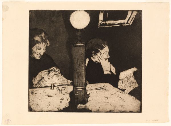 Editor: This is Mary Cassatt’s "Lydia and Her Mother at Tea," created in 1882 using etching. It has an intimate feel, almost like we're intruding on a private moment. What strikes you about this work? Curator: I find myself drawn to the complexities of the scene. Here we have an Impressionist piece that depicts a common domestic ritual, but it also subtly exposes the restrictive social structures that shaped women's lives in the 19th century. Lydia appears contemplative, maybe even bored, while her mother is occupied with the tea. Editor: So you’re seeing more than just a simple portrait? Curator: Absolutely. Cassatt, as a woman artist navigating a male-dominated art world, often focused on the domestic sphere, but not without a critical lens. Think about the limited roles available to women of that era. Tea became this important social ritual, wasn't it? A carefully orchestrated event that underscored and reinforced class and gender norms. Cassatt’s choice of etching as a medium reinforces this, its relative accessibility allowing for wider dissemination of these images of female domesticity and potential resistance. Editor: That's fascinating. The act of depicting a private moment can become a powerful statement on the condition of women in the 1880s. Curator: Precisely. By choosing such subjects and rendering them with such psychological depth, Cassatt subtly challenged those very social conventions. How does thinking about this deeper historical and cultural meaning change your view of the artwork? Editor: It makes me appreciate Cassatt's artistry on a completely different level. It's no longer just a nice image but a complex social commentary. Curator: Exactly, art provides valuable insights, but context is vital for any interpretation to emerge. Editor: I'll remember that going forward, it's so helpful to look beneath the surface of what is presented.