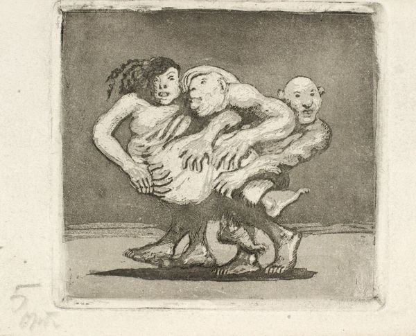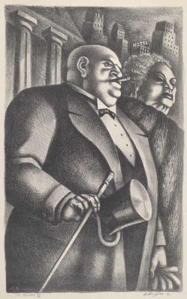 Editor: So this drawing is "Lippy Service" by Alfred Bendiner, made around 1940, a graphite drawing, or maybe a print. It looks like a snapshot of an argument, and there's this great sense of motion and contained fury... it feels like something frozen in time that could erupt at any moment. What do you see in this piece? Curator: Beyond the immediate tension, the caricature of these figures speaks volumes about cultural memory. Observe the exaggerated features – the catcher’s hardened jaw, the batter’s bellowing mouth. Bendiner, consciously or not, is tapping into a primal, almost archetypal conflict. Baseball itself becomes a stage for broader societal struggles. Editor: Archetypal how? Curator: Well, consider the ritualistic nature of the game itself: the carefully defined roles, the call-and-response between pitcher and batter, umpire and player. Bendiner amplifies these dynamics to comedic, but also critical effect. What happens when fair play is questioned? Editor: Right, there's definitely a critical tone. But why caricature? Does it make the message stronger? Curator: Exactly. Caricature allows for immediate emotional recognition, exaggerating traits that we inherently understand. It transcends individual identity, representing instead a distillation of conflict, of challenge, of power dynamics. It becomes a visual shortcut to understanding complex relationships within a defined cultural space, even something universal. The faces, like masks, play out dramas for generations. What emotional symbolism jumps out to you now? Editor: I guess seeing them as masks clarifies that neither of them represents baseball but rather the spirit of contention in general. I initially missed those layers. It is so much more than I first thought. Curator: Precisely, it captures both an era and enduring elements of human competition. A good conversation!