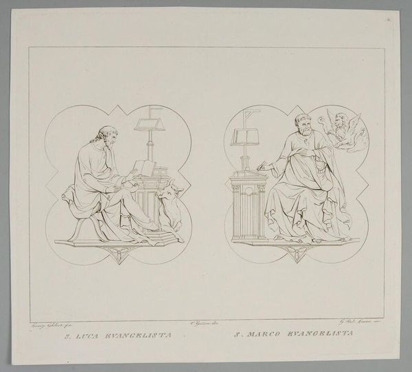 Editor: This engraving by Giovanni Paolo Lasinio depicts scenes from the South Door of the Baptistery of Florence. The linear style gives it a restrained, almost detached feeling. What do you see in this piece? Curator: The scene depicts Salome presenting the head of John the Baptist to Herodias. Notice how the artist portrays Herod's feast on one side and the gruesome presentation on the other. What emotions or symbolic weight do these contrasting scenes evoke for you? Editor: I guess the feast represents earthly pleasure, while the presentation is, well, the consequences of earthly sins. It makes you think about power, desire, and sacrifice. Curator: Exactly. Through these images, the artist creates a powerful commentary on morality and the consequences of actions. The images have cultural memory embedded within their lines. Editor: I never thought about it that way, seeing how art can carry such layered meanings. Curator: Indeed. These images are not just pictures; they are echoes of history, psychology, and cultural understanding.