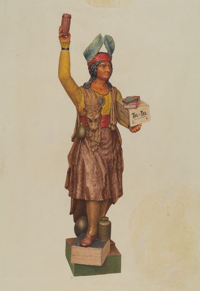 Curator: This watercolor by Charles Bowman, titled "Cigar Store Indian," dates back to approximately 1938. What are your initial thoughts? Editor: My first reaction is unease, a kind of melancholy stillness. The figure is so deliberately posed, almost frozen, which heightens awareness of the history it evokes, the context of colonial appropriation, the exploitation… Curator: Right, let’s unpack that history. The "cigar store Indian," as a trade figure, emerged in the 19th century. These carvings, traditionally made of wood, advertised tobacco shops. What is particularly intriguing here is Bowman's choice of watercolor. He's representing a mass-produced commercial object—a sign—in a handmade, supposedly “fine art” medium. Editor: The choice of watercolor transforms it into a softer, more contemplative object than I imagine a typical, painted wooden figure might be. But the caricature remains potent with complex symbolism. The feathers, the offered box of cigars... They become signifiers of a romanticized yet profoundly inaccurate representation of Native American identity manufactured to further capitalism. It’s impossible to divorce this image from the historical violence enacted upon Indigenous communities, and the continued harm caused by stereotypes. Curator: Absolutely. It invites scrutiny of the materials and modes of representation that shape our understanding—or misunderstanding—of labor, of indigenous craft, and of consumer culture itself. By rendering a wooden object in watercolor, he exposes that transformation... that transition across categories. And further questions, such as who consumed this product, made the cigars, and profited from them? Editor: What I keep circling back to is the act of Bowman, a non-Indigenous artist, creating this. The gaze is undeniably there, isn’t it? How could it not be, even in 1938? It highlights the uneven power dynamics in cultural representation. And perhaps unintentionally, exposes the myth-making inherent in creating these commodities. Curator: And it pushes us to recognize art as a product embedded in a broader network of social, political, and economic exchanges. An exchange—unequal and complex—that carries right through to today. Editor: The quiet subversion then becomes that Bowman’s choices invite us to reflect on who gets to tell whose stories and the lasting consequences of that power imbalance. A seemingly simple artwork makes complex history palpable. Curator: Precisely, its power lies in this material reimagining of such a ubiquitous, yet contentious figure.
