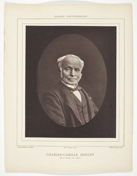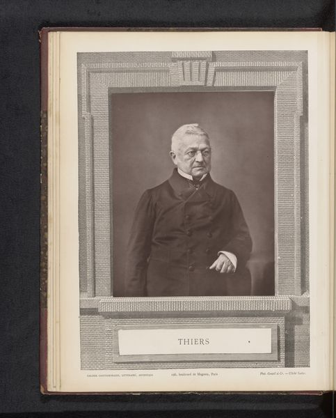 Editor: This is Nadar's "Portret van Adolphe Thiers," created sometime between 1867 and 1877. It's a photographic portrait, currently housed at the Rijksmuseum. The sternness of Thiers's gaze, combined with the sharp focus of the photograph, gives the piece a certain gravity. What do you see in this work? Curator: I see a fascinating interplay between the constraints and affordances of early photography. Note how the framing device within the print mimics the aesthetic of painted portraits. It serves to ennoble the sitter but also draws attention to the artificiality of the image itself. Editor: Artificiality? But photography is supposed to be objective, right? Curator: Objectivity is a fallacy. Observe the carefully controlled lighting, the subject's posture, and the very deliberate framing. Each of these elements contributes to a constructed image. Photography, even in its early stages, was never a simple mirroring of reality. Look closely at the textures; how do they contrast? Editor: Well, the smooth background emphasizes the sharp detail in Thiers's face and clothing, giving them prominence. Also, the ornamental frame is much less distinct. Curator: Precisely. The relative sharpness dictates where our eye is directed. How might this piece be decoded using structuralist approaches? Editor: So you’re saying that by analyzing visual elements like the contrast, composition, and textures, we can go beyond simply seeing a picture of Thiers and unlock its deeper, underlying meaning? Curator: Absolutely. These formal choices speak volumes about the subject's status and the photographer's intentions within the cultural context of the time. A deep dive into semiotics could reveal further dimensions. Editor: I see... considering the interplay between all those different elements changes the whole understanding of the photograph. Curator: Indeed, a photograph is never 'just' a photograph.