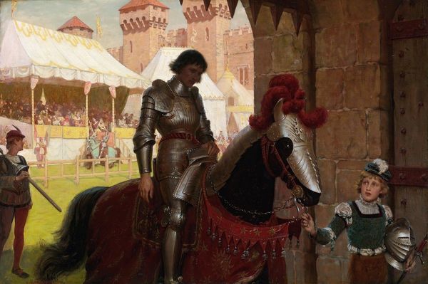 Edmund Blair Leighton created this oil on canvas painting of a medieval knight preparing to depart, sometime between 1900 and 1920. It presents a scene of courtly love and chivalry that reveals much about the cultural values of early 20th-century Britain. Leighton specialized in historical genre painting, a popular style in his time. He often depicted scenes from the medieval period, evoking a sense of romance and nostalgia for a bygone era. This image is carefully staged, making use of visual codes such as the knight's armor, the lady's gown, and the castle architecture, which conjure up a particular vision of the medieval world. Britain in the early 20th century was a society grappling with rapid industrialization, urbanization, and social change. Leighton's paintings offered an escape into an idealized past, and promoted a conservative vision of social harmony and national identity. To truly understand a work like this, we need to examine not only the painting itself, but the social, economic, and political context in which it was made and displayed. Art historical research can help us understand the values and beliefs that shaped both the artist's vision and the audience's reception of the work.