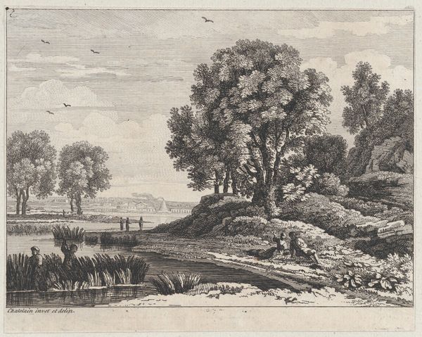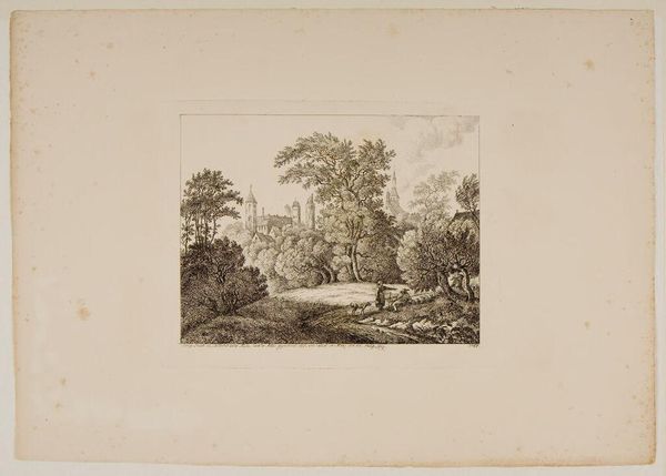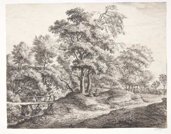 Curator: Here we have Jens Peter Lund’s “Skovparti ved Naerum,” an engraving dating back to 1851, part of the Statens Museum for Kunst collection. Editor: The level of detail is remarkable for an engraving. My first impression is one of tranquility, but there is something about the way the path curves, almost disappears that makes the artwork quite eerie as well. Curator: That path does lead the eye, doesn't it? The romantic sensibility of nature is carefully balanced here with the symbolic promise of finding the way forward, which the path illustrates, although what lies at the end remains veiled. The light also guides us. Editor: Indeed, and note how the artist uses contrasting textures, the roughness of the thatched roof and the delicacy of the foliage, to add a touch of complexity to this piece. There is an interesting use of the golden ratio here as well, with the buildings sitting close to one point, creating tension through this asymmetry. Curator: Symbolically, the home represents security, shelter, belonging. The artist subtly portrays this domestic space as part of the wildness of the untamed. This also touches on themes very pertinent in Danish culture: The sense of place and the power of belonging that are evoked when people contemplate nature and landscape. Editor: That reading certainly holds. But look at the way Lund uses lines – vertical in the trees, horizontal in the land – as structural elements in what appears, at first glance, to be a romantic rendering of nature. This brings to light not only his eye, but his artistic sensibility. It isn't only landscape, it’s formal consideration. Curator: It feels charged with something profound about humanity's place within a larger existential framework of belonging and finding one's purpose and belonging in this world. I find myself longing to walk the depicted pathway in the artwork. Editor: For me, this artwork demonstrates that close study always reveals complexity even in what seems a simple landscape engraving. I shall always admire Lund for such structural sensitivity, despite the medium’s constraints.