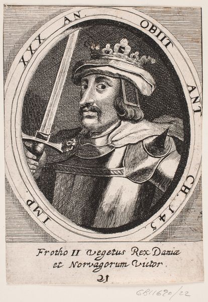 Curator: Here we have "Kong Hemming," an engraving from 1646, currently residing at the SMK, Statens Museum for Kunst. It presents a historical painting aesthetic rendered in a print medium. My gut reaction? Solemn and surprisingly direct. Editor: Yes, the contrast is striking—the white paper versus the intense black hatching and cross-hatching create a powerful sense of depth and form. Look how those lines build the volume of the armor and the face. Classic Baroque dynamism within such a small scale. Curator: It's wild to think that someone carved all those tiny lines to create this image of King Hemming. I'm really drawn to his expression though. He's holding a sword—as one does in these kinds of portraits, a symbol of power—but his eyes...there's this…sadness, or maybe weariness there? What does that say about power, do you think? Editor: Power, representation, and image. I'm wondering about that sword: It cleaves the space, creating a vertical axis mundi, you know? And how the oval frame works semiotically—as closure but also as a window onto another world—in fact the inscription itself contributes to this spatial complexity. He died in 812 according to this! He had one long reign, the letters say so... I am curious. Curator: Yes, it certainly plays on our perception of rulers, maybe all humans. The print format…it makes me wonder, what’s it trying to capture? This one historical moment, preserved, copied. Each line feels considered, heavy. Even now centuries later…I get a shiver running down my spine. It speaks, loudly even. Editor: Agreed, even with the Latin inscription adding to the work's mystique! This piece really makes one think about how techniques of engraving can give even a small artwork enormous intensity. The linear complexity lends it depth far beyond its physical size, an intense encounter across history! Curator: Exactly, It is like looking through a darkened window into his moment! The fact that it's been around for so long, and speaks about rulers from an even older time! Profound.