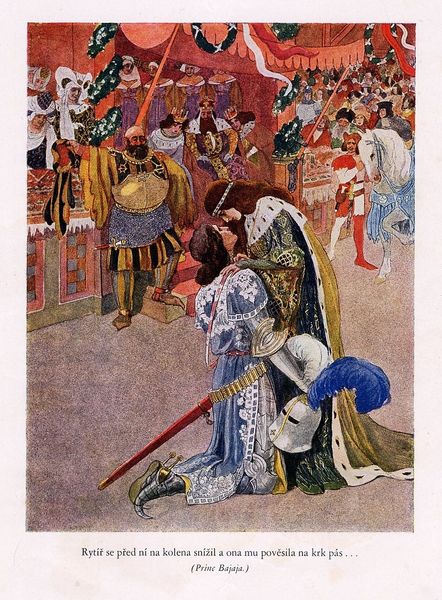 Arthur Rackham created this illustration of Sir Tristram unseating Sir Palamedes in Ireland as part of his work illustrating classic stories of chivalry. Rackham, born in London as the Victorian era was ending, made this image when social roles in England were very defined. Looking at the image, we can see the knights are presented in very old-fashioned armour, suggesting the timeless values of courage. Surrounding the event are trappings of noble society, flags, royalty, and an enthusiastic crowd. The ladies of the court in the foreground, in particular, were a very important element in the rituals of medieval chivalry. The tournaments and jousting matches depicted here were often a way for noblemen to display their status and power, particularly in times of peace. Rackham’s emphasis on a chivalric code has roots in the social and political ideals of the medieval era. Rackham takes us back to what was seen as a period of noble values. Historians use sources like period literature, illustrations, and accounts of tournaments to understand the social and political significance of these events. They provide insight into a world with rigid social structures.