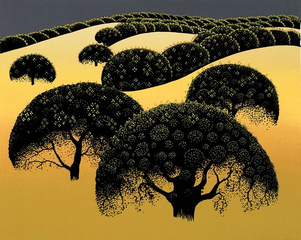 Eyvind Earle made this vibrant landscape of the Big Sur coastline sometime in the 20th century, using a smooth, almost graphic style. It feels like a memory, flattened and heightened, you know? Look at the way the light glows in the center, the yellow against those blues. It's so simple but creates depth and drama. Those little flicks and dots that create the foliage are like an obsessive meditation. I imagine him, methodically building up the image one tiny mark at a time. I love that sense of the hand, the dedication. I’m reminded of Milton Avery, especially in the way Earle simplifies the landscape to its basic shapes and colors. It’s like he’s saying, "Here's what matters, this is what I felt." Art isn't about perfect representation, it’s about sharing a vision, a feeling, and Earle really nails that here.