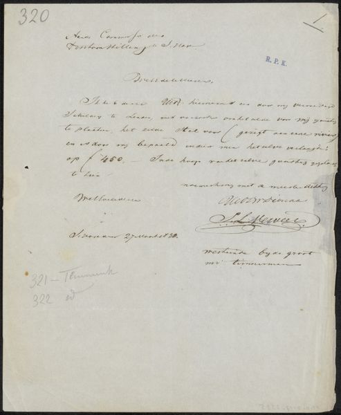Editor: Here we have "Brief aan de adjudant van Willem II (koning der Nederlanden)," or "Letter to the Adjutant of William II (King of the Netherlands)," possibly from 1848, a pen and ink drawing on paper by Izaak Schouman. It’s really just text, a letter… it feels so distant, and yet so deliberately penned. What do you see in this piece? Curator: This, to me, whispers of intimacy cloaked in formality. It's not just words on paper; it's a fleeting glimpse into the corridors of power, wouldn’t you agree? The script itself—doesn't it evoke a sense of urgent secrets and carefully constructed pleas, penned perhaps under the flickering light of a candle? This moment, frozen, isn't it hinting at something far grander, a political chess game played out on the stage of Europe? Does that strike a chord for you too? Editor: I see what you mean! The handwriting does feel hurried, but elegant. It’s less about the words themselves and more about the context – the king, the adjutant… I guess I wasn't giving the *story* behind it enough weight. Curator: Exactly! It reminds me of Emily Dickinson hiding away composing beautiful poems, because beneath its veneer of officialdom, a human drama plays out. I mean, even something mundane can suddenly blossom if viewed through a lens of care and creativity. Don't you think so? Editor: Definitely. I went in thinking 'old letter, boring'. Now I see the hidden depths! Curator: That's the joy of art, isn't it? Finding the extraordinary within the seemingly ordinary. Never forget to look, reflect and… then look again.