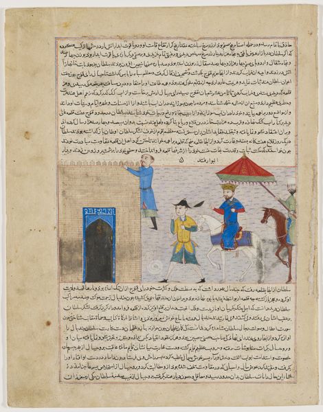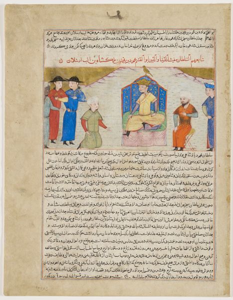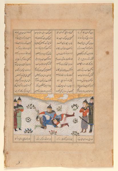 This is a vivid scene made by Ḥāfiẓ-i Abrū around 1430 using opaque watercolor, ink, and gold on paper. Our attention is immediately drawn to a pitched battle taking place at the camp of Oghuz Khan. The foreground teems with dynamic figures in bright reds and greens, drawing our eye, while the background is anchored by a symmetrical, geometric tent. The formal structure of the composition divides the image into distinct zones. Below, warriors clash, brandishing bows and arrows. Above, a tight cluster of soldiers on horseback appear more composed. There is a striking contrast between the chaotic melee below and the regimented order above. This contrast emphasizes a symbolic division between the immediacy of conflict and the measured authority of leadership. The tent as the geometric centerpiece adds a layer of semiotic complexity. Its stylized form acts as a signifier of order and stability amidst the surrounding conflict. The image functions as a narrative tableau, capturing the dynamism of battle but also hinting at the underlying structures of power and social order that define this world.