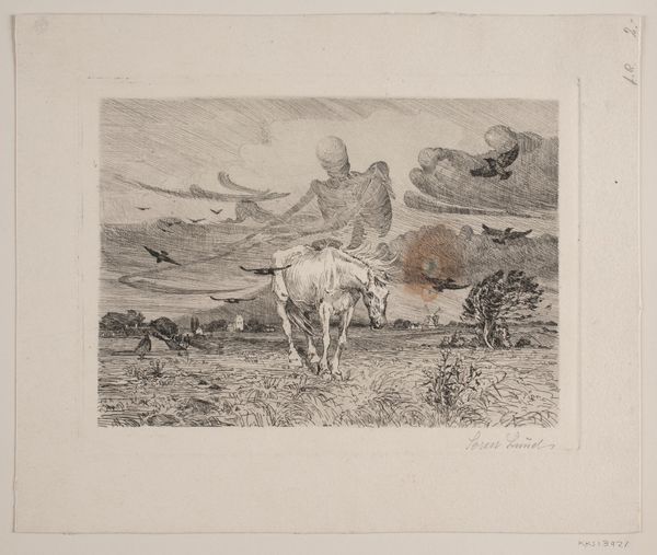 Jan Dam Steuerwald created this print, "Schaap en lam," with etching. Notice how the monochromatic palette emphasizes the scene's textures. Steuerwald masterfully uses light and shadow to create a sense of depth, particularly in the sheep's wool, which appears almost tactile. Consider the composition's structure. The sheep and lamb are centrally located, drawing our eyes immediately to them. Steuerwald uses the water's horizontal plane to divide the image, grounding the animals while the turbulent sky above adds a sense of drama. The artist plays with contrasts: the soft wool against the sharp reflections in the water, the solid forms of the sheep against the fleeting clouds. Is Steuerwald commenting on nature's delicate balance? The sheep, dependent on water, mirror our own reliance on natural resources. This etching is more than just a pastoral scene, it's a meditation on our connection to the environment.