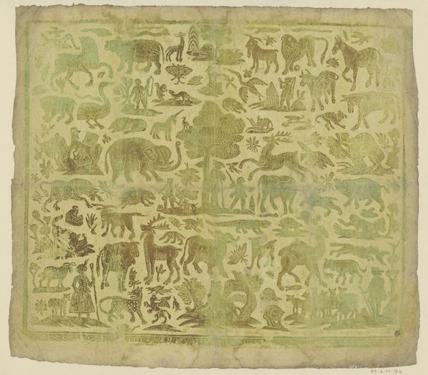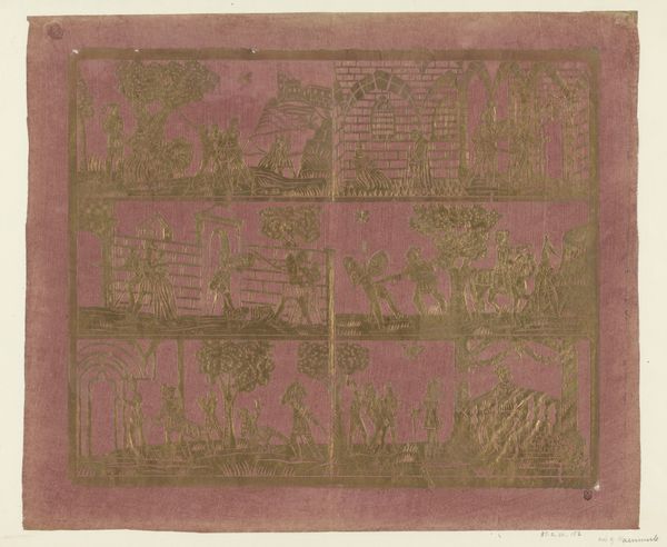 Editor: This decorative paper with chinoiserie motifs, made between 1750 and 1794 by Johann Carl Munck, is a feast for the eyes! The intricate patterns and tiny scenes really draw me in. What stories do you think these symbols are trying to tell? Curator: Precisely! This isn’t merely decoration; it's a window into 18th-century Europe’s fascination with a fantasized Orient. Chinoiserie, like many Rococo pieces, carries potent symbolism. Notice how the figures are presented, and what feelings do the color choices provoke? What do you read from these scenes? Editor: Well, the figures are small and seem to be engaged in courtly activities or perhaps involved in religious processions, all framed by exotic flora. And the color choice certainly adds a certain antiquity to the work. Are you suggesting these images carry political or social commentary, subtly critiquing European society through an exotic lens? Curator: That’s insightful! The imagined East often served as a canvas for European desires, anxieties, and social critiques. The scenes, though whimsical, highlight the perceived luxury and supposed ‘otherness’ of the East, subtly reflecting on European ideals and power dynamics. Notice how the pattern almost flattens the figures, blurring the boundaries between reality and fantasy. Editor: It's amazing how much information is encoded within what seems like just a pretty pattern. Now I am left wondering what people used it for and what their intention for printing was? It certainly offers some fascinating food for thought. Curator: Indeed. This paper served both a decorative purpose and, subtly, to carry cultural baggage. These motifs served not only aesthetic needs, but can tell of trade, colonialism and representation. That's why the cultural memory embedded in visual symbols is an active field of interpretation and why its analysis provides insights that echo through the centuries.