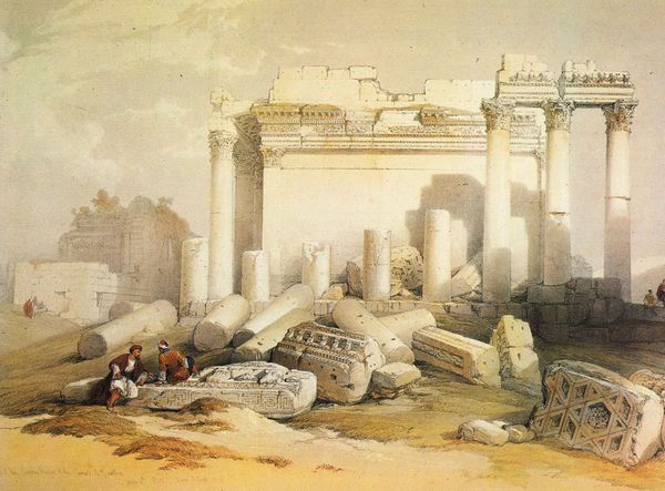 Editor: This drawing by David Roberts captures a general view of Baalbek, though the exact date isn't listed. It seems to be a watercolor and charcoal drawing. I find it evocative, portraying both grandeur and desolation simultaneously. What strikes you most about this piece? Curator: I’m drawn to how Roberts positions us within this landscape of ruins. Notice how he foregrounds those figures lounging with their rifles. What do they represent to you? Editor: Perhaps a contemporary presence, a contrast to the ancient ruins? They do bring a human scale to the scene. Curator: Precisely! And observe their positioning. Are they guarding something? Are they simply resting amidst the remnants of a lost world? Those ancient stones become a palimpsest of cultural memory, layered with interpretations across time. It's that constant negotiation between the past and present. Do you see a story here, or competing stories, being told through imagery and visual positioning? Editor: I hadn't considered the guarding aspect; that shifts the entire atmosphere. So the ruins become not just a picturesque scene but a contested space. And with those arms… they carry their own history. Curator: Indeed! The weapons themselves act as symbols of power, perhaps even warning of potential conflict. This blend of serene landscape and implied threat speaks to the complex cultural narratives embedded in this site. What did you pick up through this analysis? Editor: How symbols speak and their emotional, cultural and psychological weight they hold. It changes the entire artwork. Thanks! Curator: A landscape, when viewed as a cultural object, unveils a tapestry of narratives about human interaction and its relationship with the past, adding weight and continuity through visual elements. Thanks!