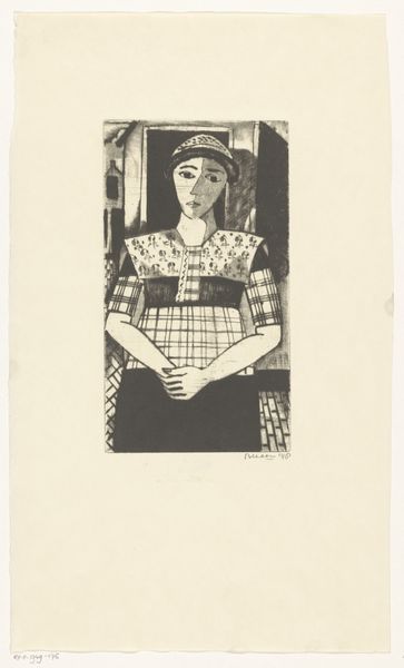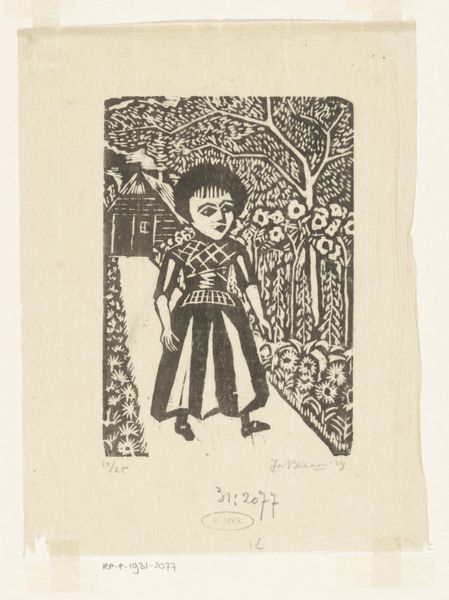 Curator: Jo Bezaan created "Voorjaar," or "Spring" in 1948. It's an etching, a type of printmaking, rendered in ink on paper and held in the collection of the Rijksmuseum. Editor: Immediately, the composition strikes me as delicately haunting. It's not explicitly mournful, but there's an arresting quietude about it, wouldn’t you agree? Like a whispered secret caught on paper. Curator: Absolutely. Bezaan's works often play with that kind of nuanced emotion. Her figures are positioned in nature, always a little isolated, but also very much a part of the scenery. Editor: I am thinking about that very intersection. Notice how the artist has placed this solitary girl amidst a flowering tree and fluttering butterflies – visual symbols of hope, growth, renewal, even resurrection – yet she looks away from us, her posture somewhat defeated. Is Bezaan commenting on the elusive nature of hope in a postwar world perhaps? The Netherlands had only recently been liberated at the time. Curator: That's a compelling reading! The imagery resonates powerfully with themes of recovery and the bittersweet realities of springtime renewal after hardship. It's almost like a memento mori, the butterflies a visual reminder of fragility. Editor: There is something unnerving too about the gaze that fails to meet ours. What’s she thinking? To me, she’s both vulnerable and defiant. Curator: The tension is palpable. But Bezaan does that so well. There's an ambiguity, a layered understanding of what it means to be alive, to feel. Perhaps it’s as simple as that. Spring as a metaphor for the precarious balance of youth and looming responsibility. Editor: Or it could speak to broader issues about female autonomy, then and now. She is trapped in her own gaze and at the mercy of how people interpret her gesture: is it joy or sorrow? Either way, it feels generative. The magic of this art lies in its quiet protest! Curator: It invites endless dialogue, doesn't it? Thank you for that thoughtful perspective. Editor: Thank you. This has deepened my appreciation for the complexities within Bezaan’s delicate lines.