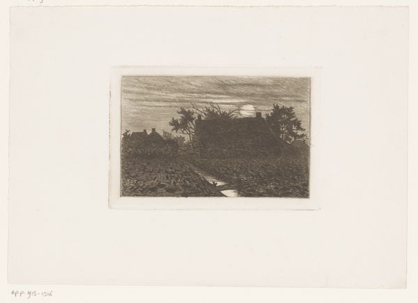 Emile de Baré made this print, "View of a Lake at Dusk with a Church Tower in the Background," using etching techniques. This landscape presents a serene view, yet it's important to consider the societal context in which de Baré operated. As a white European male artist, his perspective was inevitably shaped by the norms and power dynamics of his time. The deliberate composition, the subtle play of light and shadow, it evokes a sense of quiet contemplation. However, it's also worth noting that such idealized depictions of nature often served to obscure the realities of industrialization and urbanization that were rapidly transforming the landscape, especially for the working classes. It invites us to reflect on the complex relationship between art, nature, and the social forces that shape our perceptions.