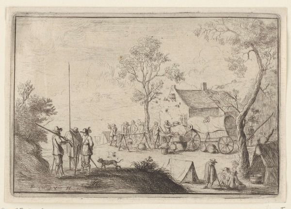 Jan van Goyen made this drawing titled "Jaarmarkt" using pen in grey-brown ink. The jaarmarkt, or annual market, was a significant social and economic event in the 17th-century Netherlands. This drawing captures the vibrant atmosphere of the market, a place for trade, socializing, and entertainment. We can see tents, people gathered in groups, and a church in the background, indicating the market's central role in community life. Van Goyen's choice to depict this scene reflects the growing interest in genre painting, which focused on everyday life and the activities of ordinary people. By studying archival documents, such as market regulations, guild records, and personal accounts, we can gain a deeper understanding of the social and economic context of these events. Van Goyen's drawing serves as a valuable visual document, offering insights into the cultural values and social structures of the Dutch Golden Age. It’s a reminder that art is always embedded in a specific time and place.
