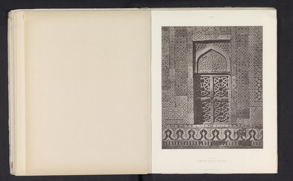 Curator: The intricacy is just astonishing. Editor: It certainly is. This print captures marble decorations within the Red Fort in Delhi, sometime before 1885. Curator: The patterns speak volumes about the layered symbolism inherent in Islamic art. Each geometric element resonates with deeper spiritual meaning. The infinite repetition hints at the vastness and the unified essence of the divine. Editor: And its purpose was far from purely aesthetic; as decorative art within a royal context, its role served a social function. Its complexity signals imperial power and refinement. This served as both an inspiration for, and reflection of, the sophisticated courtly culture that flourished under the Mughal rulers. Curator: The central dark square could be understood as a symbol of the Kaaba, the holiest site in Islam, toward which all prayers are directed. Editor: Interesting—the black cube, or something acting as a sort of cosmic omphalos—the ultimate direction-giver. But let's also consider the act of replicating this. How did printmaking and its associated accessibility shift cultural understanding of the Fort? By reproducing decorative works like these in a print, its influence was spread far beyond the fort itself. Curator: The medium’s choice also plays into my reading, it’s all geometry, and Islamic art often employs symmetry to portray perfection. Look how patterns echo and reflect one another! In visual harmony, it creates balance that promotes inward contemplation. Editor: Absolutely. And let’s also look into that balance politically. Creating printed documents displaying elements of imperial rule, it almost sets them as an ideal; creating these objects normalizes, to a point, what imperial control looks like. Curator: Understanding visual artifacts like this is key. The way geometric symbols create bridges between our mundane existence and higher spiritual realms transcends cultures and time. Editor: Yes, but looking into context gives me great insight into ways these resonate differently through our changing societal conditions. It encourages an inclusive understanding that considers all forces surrounding image production.