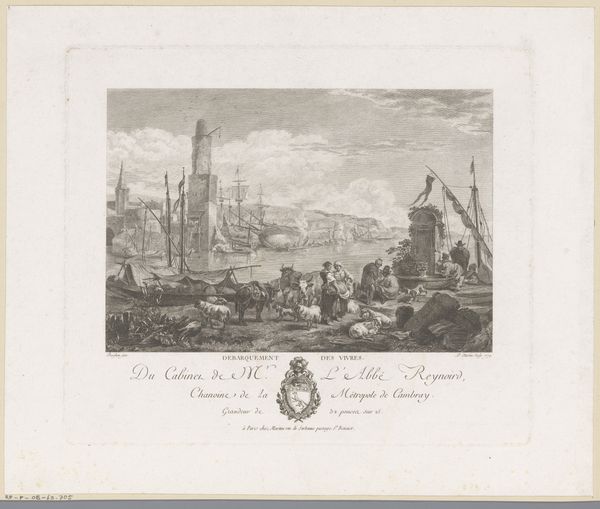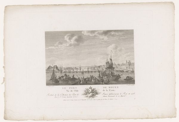 Curator: Today, we're looking at "Haven van Lorient," or "Port of Lorient," a print that the Rijksmuseum attributes to Yves Marie Le Gouaz, likely made between 1776 and 1816. Editor: Wow, a bit melancholy, isn't it? I'm drawn to the pale wash of the paper, and the activity… mostly repairs, it seems. Like a seaside hospital for ships. Curator: It's an etching and likely a labor intensive one given the textures and gradients. Consider the socio-economic conditions of Lorient. It served as a crucial hub for the French East India Company, indicating significant global trade connections and flows of materials at that time. The depiction of laborers and ship repair alludes to a stratified society reliant on maritime commerce. Editor: And you can almost hear the rhythmic hammering and creaking ropes. There's a whole social world buzzing beneath the surface of that still water. Do you think that this reflects a realistic snapshot of the harbor's daily life, or something more composed? Curator: Good question. Given Le Gouaz’s occupation, he must have witnessed port scenes like this frequently. The depiction could indicate a tension between romanticized notions of maritime ventures and the grittier realities of labor that actually enabled them. The level of detail given to infrastructure, ships, and the various jobs would highlight the processes required to participate in global trade at the time. Editor: I notice the contrast. While those ships are wounded, there are also symbols of power represented by the Coat of Arms, so there are messages of strength interwoven with messages of recovery. What is its lasting legacy? Curator: Its legacy lies partly in visualizing a particular historical moment, yes, but also how maritime activity connects with social hierarchies and material flows. Editor: To me, it's a tender reminder that even the mightiest vessels are ultimately at the mercy of time and tide, requiring the hands of many to mend their wounds and prepare them for the vast unknown. It really causes a deep appreciation for ports as meeting places, not just of the east and west, but a place for repair and trade.
