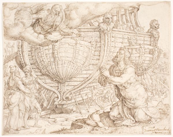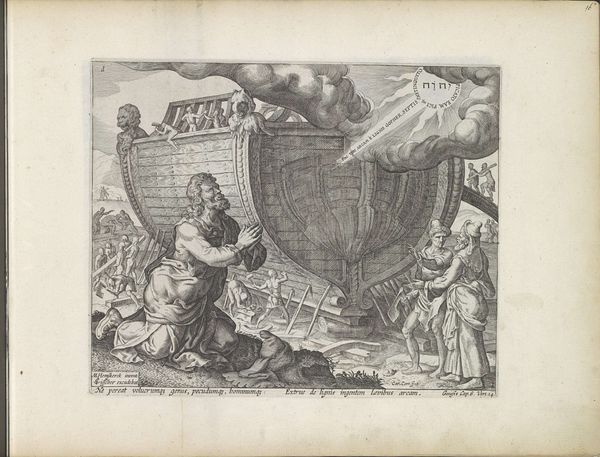 Cornelis Cort created this engraving, God Orders Noah to Build the Ark, in the late 16th century. Dominating the scene is the ark itself, a vessel of salvation. God appears in the upper right, holding a globe, symbolizing His dominion over the world. Noah kneels in prayer, receiving the divine command. The motif of the ark is fascinating. It is not merely a boat; it's a symbol of rebirth and hope amidst destruction. Similar themes echo in ancient myths, such as the Epic of Gilgamesh, where a great flood necessitates the construction of a vessel to preserve life. This motif recurs throughout history, embodying humanity's collective memory of cataclysm and renewal. Consider the emotional weight of the image: the desperate plea for deliverance, the divine promise of salvation. Such narratives tap into deep, subconscious anxieties and hopes, engaging viewers on a primal level. As we journey through time, this symbol resurfaces, constantly evolving, reflecting our enduring quest for meaning in the face of chaos.