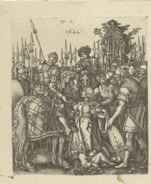 Editor: This is "The Israelites Taking the Followers of Baal Captive," an engraving by Philips Galle from around 1567 to 1570. It's striking how much movement he creates with just lines, but the violence is also very unsettling. How do you interpret this work? Curator: Considering only its formal qualities, the engraving's power resides in its intricate orchestration of line and form. Note how Galle uses cross-hatching to create depth and shadow, directing the eye to different areas of the composition. The figures are rendered with a Mannerist elongation, enhancing the sense of drama. Where do you see visual balance, or perhaps intentional imbalance, within the image? Editor: Well, the left side is chaotic with all the action, but the right feels very controlled and rigid with the architectural elements and more posed figures. Is that contrast important? Curator: Precisely. The juxtaposition establishes a dynamic tension, highlighting the conceptual separation between the act of capture and the apparent judgment being passed. Also, consider the composition with respect to foreground, mid-ground, and background, and how that spacing contributes to the narrative. Editor: So, the way he organizes the scene contributes as much to the story as the figures themselves? Curator: Indeed. Galle’s formal choices are paramount in constructing the narrative and conveying its emotional impact, independently of the depicted content. Editor: I see it now! The composition isn't just a backdrop, it's an active participant. I'll never look at an engraving the same way. Curator: A fitting lesson! The visual structure informs, dictates, and becomes the ultimate story.