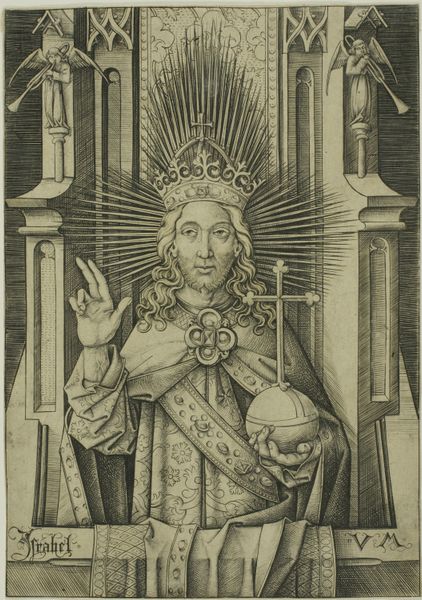 Jacques Granthomme made this engraving, Christus als Salvator Mundi, using the printmaking technique of engraving. The artist would have used a tool called a burin to manually carve lines into a metal plate, likely copper. Ink is then applied to the plate and then wiped off the surface, remaining only in the carved lines. The plate is pressed onto paper, transferring the ink and creating a print. The texture of the paper and the depth of the engraved lines contribute to the overall visual experience. The medium's inherent quality of reproducibility would have allowed for the wide distribution of this image, making it accessible to a broader audience than a unique painting. Engraving demands both technical skill and artistry, reflecting a tradition of craftsmanship intertwined with religious messaging. Understanding the labor-intensive process and the social context in which this print was made enriches our appreciation, blurring the lines between craft and fine art.