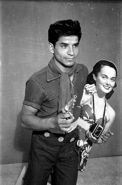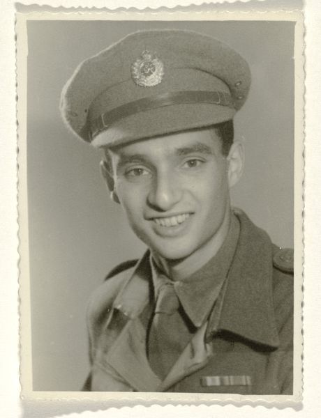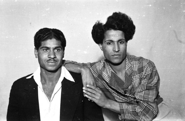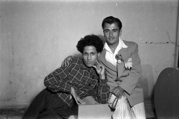 This work is one of a series of black and white silver gelatin photographs of varying sizes that are collectively titled Objects of study/The archive of studio Shehrazade/Hashem el Madani/Studio Practices. All of the photographs were taken by the Lebanese commercial photographer Hashem el Madani between 1948 and 1982 and compiled into the present group, 117 of which are in Tate’s collection, by the Lebanese artist Akram Zaatari. All of the photographs include people, either alone, in pairs or in small groups, and most were taken in Madani’s studio, although some were shot outside and in his subjects’ homes. The series features men and women and covers a wide age range from babies to elderly people. Almost all of the sitters assume poses deliberately for the camera, sometimes accompanied by props or costumes, and most gaze directly towards the lens. Many of the pictures show subjects interacting in various ways, including embracing, kissing and acting out scenes, such as a mock wrestling match. The photographs are mostly tightly cropped, with the sitter or sitters filling most of the frame, although in some cases the figures are positioned further away from the camera, for instance when shown sitting at a table or standing behind a chair. The photographs tend to have sparse backgrounds, often dominated by a blank posterior wall. They are mounted on white paper, displayed in plain white frames and signed on the back by Madani. Many of them have been organised into categories by Zaatari – such as a group featuring men dressed as Syrian resistance fighters and a collection depicting newly married couples – while the rest are presented individually. Zaatari has stated that although he prefers these groups to be displayed together, this is not a requirement (Akram Zaatari, email to Rachel Taylor, 24 April 2008, Tate Acquisition file).