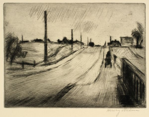Salvatore Pinto’s “Outgoing Trains” is an etching made with black ink on paper, probably sometime in the mid-20th century. The printmaking process gives this image its character. The artist would have first coated a metal plate with a waxy ground, then scratched the design into the surface, exposing the metal beneath. The plate was then submerged in acid, which bit into the exposed lines, creating grooves that would hold the ink. Finally, the plate was pressed onto paper, transferring the image. Look closely, and you can see how the varying pressure and angle of the artist’s hand have created lines that range from delicate to bold, capturing the scene’s grimy industrial atmosphere. The subject matter – trains, tracks, and urban infrastructure – speaks to the energy of the industrial age, when both goods and labor were transported en masse. The print itself, as a multiple, is connected to this social reality. It invites us to consider how the work’s material and method are tied to wider issues of labor, politics, and consumption, blurring the boundaries between fine art and the everyday.