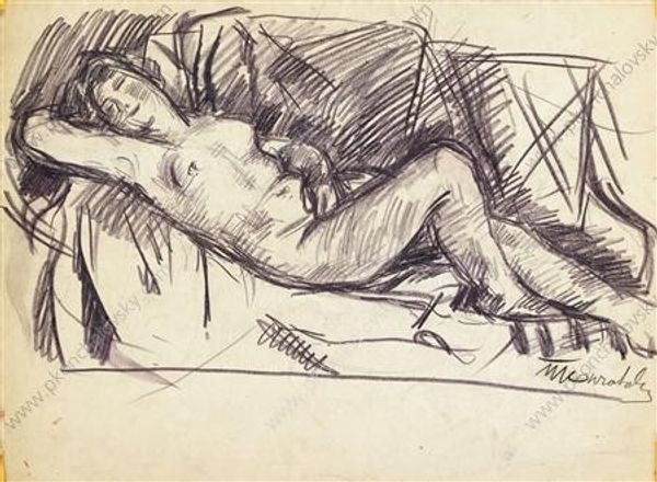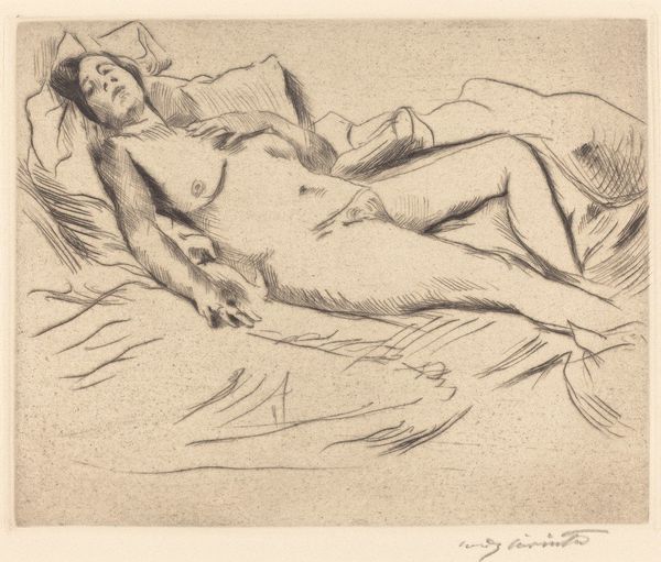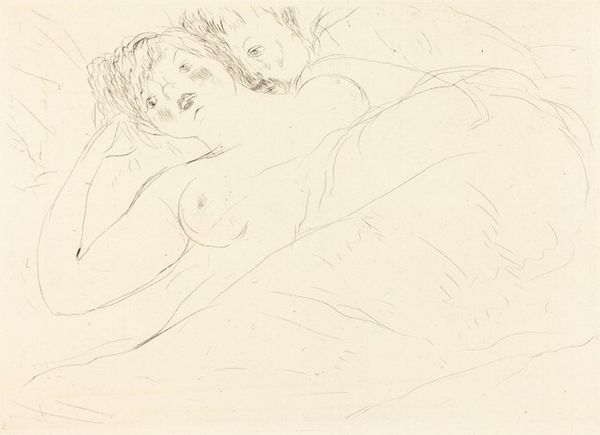 Editor: Henri Matisse's "Reclining Nude," painted in 1925, is quite captivating! I find myself drawn to the way the soft, almost muted colours create this sense of intimacy and quiet contemplation. The subject's pose feels very natural and relaxed. How do you interpret this work, looking at its symbolism and visual language? Curator: I'm intrigued by how Matisse positions the reclining nude within the historical trajectory of the odalisque, but disrupts the orientalist fantasy with a modern, intimate gaze. It suggests a departure from the exoticized, objectified female form towards a more personal and psychological exploration. The somewhat confined space in the picture could symbolize a personal, interior world. Editor: An "interior world," that is interesting! The way she has covered her face does bring a contemplative tone. What does that particular body language communicate, do you think? Curator: The gesture of covering the face may represent an evasion, secrecy, shame or melancholy. Think of classical sculptures, veiled figures, such concealment opens a conceptual space where viewers become part of decoding the imagery’s psychological landscape, hinting towards concealed feelings. Editor: So the obscured face actually *invites* the viewer in, prompting introspection rather than shutting us out. Fascinating. Curator: Exactly! Consider how the simplified forms and the muted color palette, deviate from realism, drawing attention to emotional responses through abstraction rather than meticulous detailing. The real is communicated emotionally not photographically. How do you think this emotional messaging sits within the Fauvism movement? Editor: Now that I reflect upon our discussion, it occurs to me how revolutionary his reductionist approach really was, moving beyond mere representation toward this symbolic language of form and color. Curator: Precisely! Art reveals not just visual details but the evolving ways humans relate to visual culture across time.