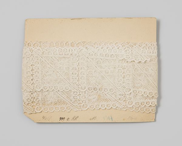 Editor: So, this is a photograph of a strip of white lace on a piece of cardboard, taken around 1925. It's currently at the Rijksmuseum. I’m really drawn to how it elevates something so seemingly simple. What story do you think it's trying to tell? Curator: This photograph isn't just about showcasing lace. It's a relic of a specific historical context. The 1920s were a transformative period for women. The rise of photography as an artistic medium coincided with these shifting social roles, and everyday objects—especially those associated with domesticity and femininity, such as lace—took on new layers of meaning. How do you think this piece plays into the traditional versus the modern, given those factors? Editor: Well, it feels…almost defiant? Lace has been associated with the wealthy elite, right? Displaying a photograph of it feels like it’s commenting on those roles, but it doesn't explicitly reject them either. Curator: Precisely! By isolating this fragment of lace and presenting it in a fine art format, the artist is encouraging us to consider the economic implications of this traditional craft. Also, consider that photographs from this time were not nearly as easily accessible as they are now. What do you suppose that may have suggested to audiences then? Editor: That makes total sense. I see now that It highlights that social power by transforming such a delicate craft into something permanent. Almost like advertising, or perhaps making accessible, this previously exclusive craft? Curator: Exactly. It becomes about making a statement about the state of things as much as it is an artistic composition. It's amazing how an image so seemingly simple on the surface has embedded within it all those elements and interpretations, don't you agree? Editor: Absolutely. I hadn't thought about the cultural context so directly influencing the interpretation of a piece of art like this. This has really changed my perspective on photographs of common objects!