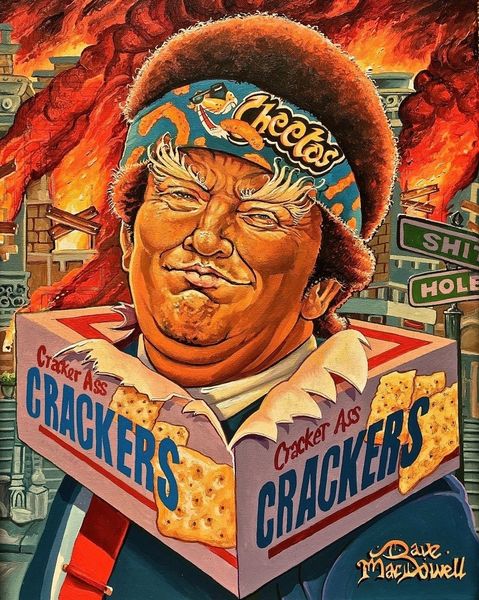 Editor: This painting, entitled "The Orange Bastard!", has a sort of chaotic, cartoonish energy, even though it also feels quite critical. It's acrylic on, well, I'm not sure, but the figure at its center looks… unsettling. What jumps out at you when you look at it? Curator: Well, besides the rather pointed title, and the Molotov cocktail starter kit he's brandishing, I'm drawn to the sheer theatricality. It's like a punk rock opera distilled into a single, gloriously garish image. Notice how the burning Capitol building isn't just background; it’s almost another character, isn’t it? Dave Macdowell, is really laying bare a particular frustration here, and using hyperbole as his weapon. What do you make of the symbolism at play? Editor: The Confederate flag motif repurposed as a vest is... provocative. And the Twitter logo feels very pointed too. Is he critiquing the individual, or the systems that he sees as enabling him? Curator: Perhaps both, darling. Think about it – the personal is political, no? The layering of symbols—Confederate flag meets social media—speaks to a very modern form of…let’s call it discontent, shall we? There's a wildness here, an almost childlike rage, captured with a surprisingly deft hand. He paints how he feels and wants us all to take notice. Does the painting resonate with you or leave you cold? Editor: It definitely doesn't leave me cold. There's so much anger and accusation packed into one image! I think seeing all these symbols mashed together definitely creates a statement. Curator: Exactly! It's a statement alright, a fiery one that hopefully sparks some serious reflection. I love art that acts as a mirror – even when it's reflecting something uncomfortable.